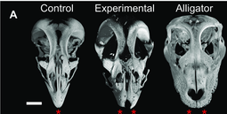 The effects of inhibiting the fgf8 gene during snout development: the beak of a chicken (Control) begins to look a lot more like the snout of an alligator. (Bhullar et al. 2015)
