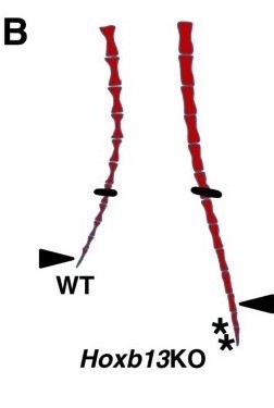 The effects of knocking out the Hoxb13 gene (right) in comparison to a normal chicken (left). The experimental chicken has a few more vertebrae in the tail, making it that much more dino-like. (Rashid et al. 2014)