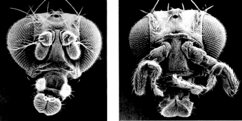 A normal fruit fly (left) and a fly with legs on its head! Image credit: François-Xavier Blaudin de Thé